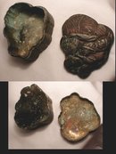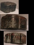 I know the photos are dark but this metal box is really dark in person so it was hard to get a good photo. If you click on any of these you can enlarge it and get a much better idea of how detailed and unusual this odd shaped box is. IT has not been cleaned so the ornate works on the sides really don't show up that well. The top has a chinese man ? woman? with a hook in their mouth which I am assuming was used to weave this basket they have in their hands. THis box is REALLY heavy for its size. The dimensions are 3" x 3" x 1 3/4".THis was either a snuff box or a small sewing box. IT is a really neat antique box.