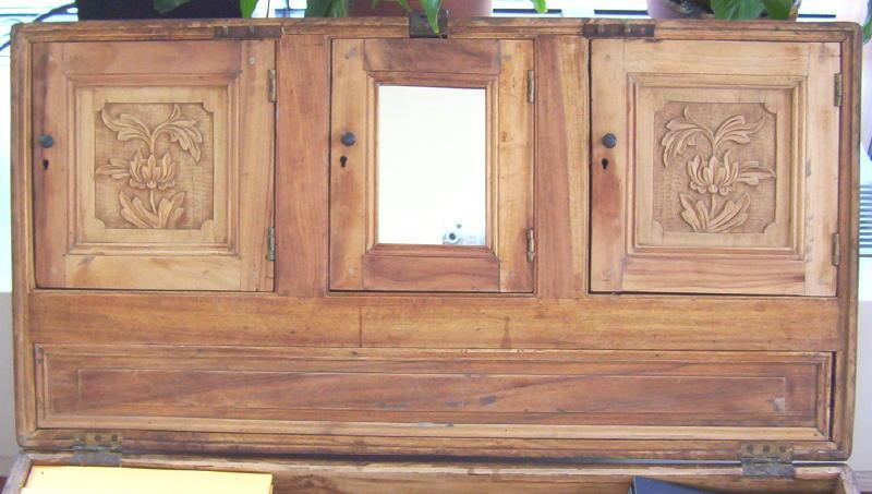 Our antique China trade chest dates from circa 1890 and was made from aromatic camphor wood. Restored and imported from India about 15 years ago. This form of chest was popular in the 19th century for preserving linens and other delicate items, and this chest was likely used along the Silk Road. It was designed in campaign style with removeable trays and compartments almost like a traveling dresser. The inside top panel features three window compartments, with the outer doors featuring intricately carved floral designs, and the center door has a mirror. Stout bail handles on the sides and extensive brass banding at the corners. Measures 34" long by 16" high by 18" deep. Shipping point: Palm Beach, FL.