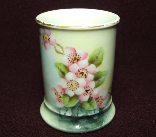 Antique handpainted and signed Limoges, France porcelain toothpick holder, from William Guerin & Co., in pale green with pink blossoms. This charming item has the green Limoges, France trademark of W. G. & Co. (William Guerin & Co.) which dates it to 1891 - 1932. It is also signed by the artist, Hotchkiss. The holder measures approximately 2.25 inches high and 1.25 inches in diameter. It is in very good condition, with no chips or cracks. The handpainting is in very good condition although there is some wear around the top and bottom rims. Please refer to the 4 photographs for appearance and condition. Shipping / packaging will be $6.00.