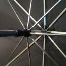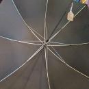 Offering this beautiful late 1800's Victorian ladies umbrella. The handle is made of rolled gold with ornate curved scrolled leaf and fringe patterns, center of handle is elegant mother of pearl. Handle measures 8 1/2 inches long; new chrome tip, chrome tips on the metal spines of umbrella; chrome shaft. The material part and spines are new replacements; 100% nylon; rich black color, very clean, no holes or stains; when open, diameter of umbrella is 36 inches; overall height from top of handle to tip is 33 1/2 inches. Has the wrap around strap with chrome snap for closing. Good+++ condition on handle, there are no cracks or chips on mother of pearl; gold has a few small dents where handle meets shaft, monogrammed on top of handle, still a magnificent umbrella, a true work of art, for your collection and use on special occasions!