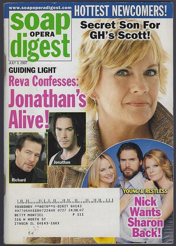 Soap Opera Digest Magazine July 3, 2007. Guiding Light Reva Confesses, Jonathan's Alive on the Cover. Articles inside include Hottest Newcomers. One Life To Live Prom Fantasy, Judi Evans, Caitlin Van Zandt and more. Filled with Photographs of your favorite Soap stars and vintage advertising. Magazine is in good condition, wear at edges