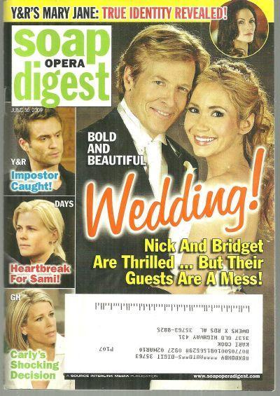 Soap Opera Digest Magazine June 30, 2009. Bold and Beautiful Wedding on the Cover. Articles inside include Another World, Trevor St. John, Elizabeth Keifer and more. Filled with Photographs of your favorite Soap stars and vintage advertising. Magazine is in good condition, wear at edges.