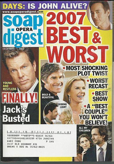 Soap Opera Digest Magazine December 11, 2007. 2007 Best and Worst on the Cover. Articles inside include Best and Worst 2007, Ricky Paull Goldin, Michael Park, and more. Filled with Photographs of your favorite Soap stars and vintage advertising. Magazine is in good condition, wear at edges