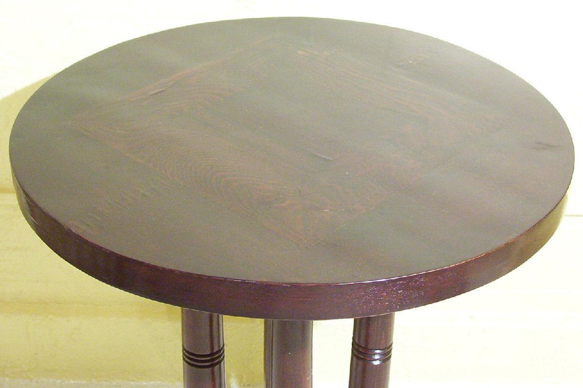 This unique, mahogany art deco table imported from Hungary dates from circa 1920-1930. Measures 26" high by 24 3/4" in diameter. Features four bobbin turned supports, resting on a square pedestal. Rich, reddish brown finish. Overall condition is very good. Largest flaw is a 1/4" nick from the top edge. Some other small nicks and scratches here and there. Additional images forwarded upon request.