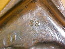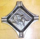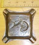 This is a very nice clean cast iron ashtray with a cast hunting dog carring a game bird in the dog's mouth. The dog appears to be a retreiver, and is located in the bottom of the inside of the astray. The size of the tray is 4.5" x 4.5", and has a hang hole in one of the four cigarette holder areas. The cast design is quite good, lots of detailed work! There is a few small casting voids, in fact one in the bottom corner goes through, but we believe this to be as cast, or original to this piece, and regard it as a minor casting flaw. There seems to be some sort of a light nickel or similar plating on this piece, not rusty or pitted. The bottom is marked with a "33" and that is the only marking, so we don't know who the maker was, but have not found another one like it. It weighs about 1/2 pound. A rare and collectible art cast ashtray!