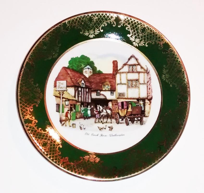 Weatherby Falcon Ware scenic plate, entitled "Old Coach House- Woolhampton". Dark green border with gold lace overlay, measures 6.5"d. Made in England. Unknown date, but likely from the 1930s-50s, and part of a series. Excellent condition, with no chips or cracks; gold lace intact, though lighting in photo caught only part of it. Inglenook Antiques...Established 1989.