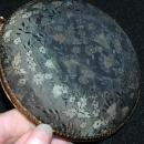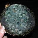 Beautiful Fine Needle Point and Tapestry Glass Line Ashtray -Fancy. The green tapestry is covering a solid frame. The needle point is in the center bordered by metallic rickrack. The the frame of it is engraved brass with the cigarette holder looks like a leaf with ornate embossed design. The color of the tapestry is a dark green gray sage. It looks wonderful with the brass trim.