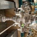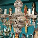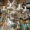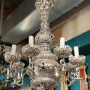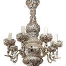 Our silvered metal chandelier in the Baroque style dates from the early 20th century and has eight electrified candles and ceiling plate. Measures 39 in tall and 24 in across. Apparently cast in spelter with silverplated finish. Maker is unknown. In cartouches on the ceiling plate are the marks of the letters SS and the letter C below, plus a scepter with cross. The style and quality is comparable to the works from E.F. Caldwell of the 1900s to 1910s.