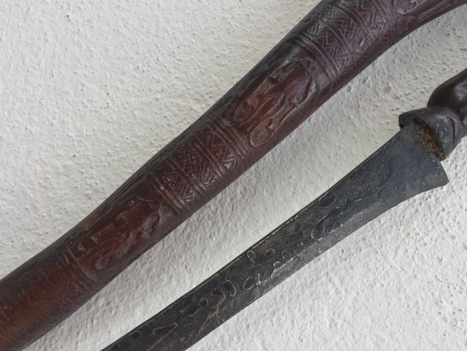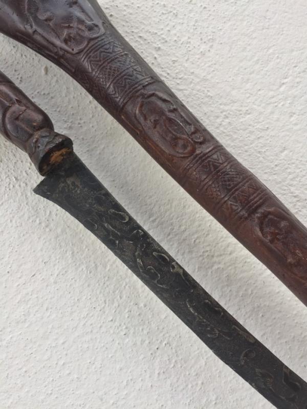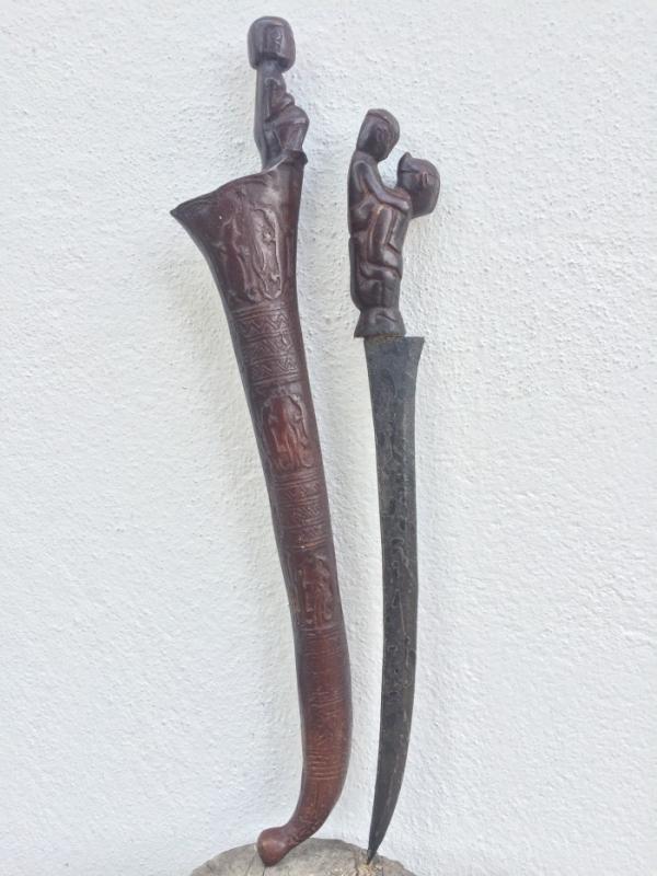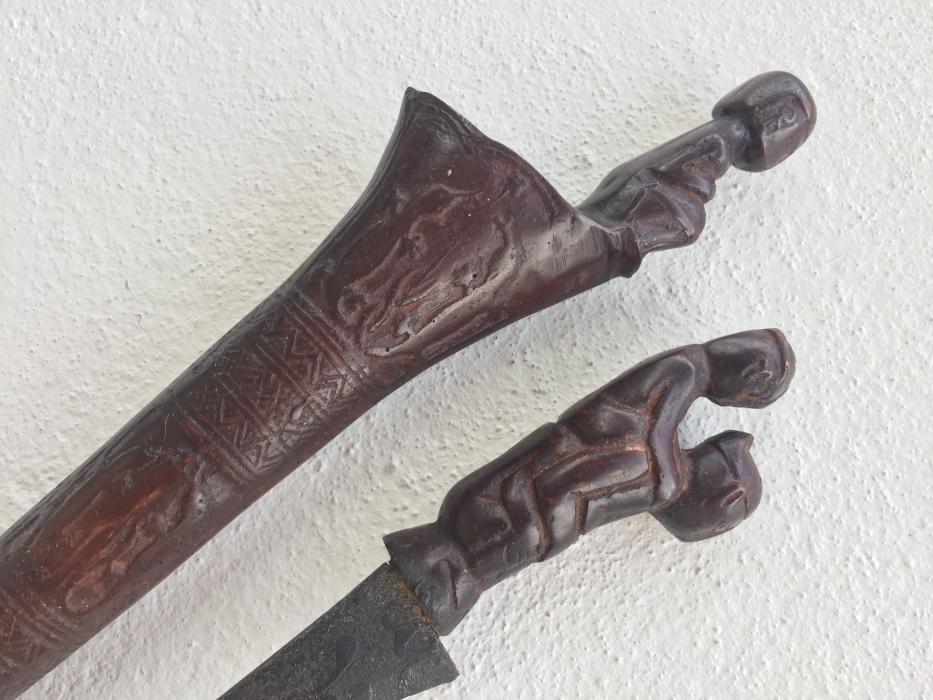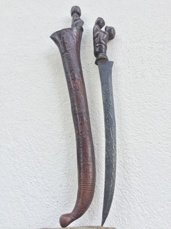 A lovely Badik, of Batak origin from the Malay Archipelago with ancestral male & female figure. Sometimes referred to as a butterfly knife due to its shape, but not to be confused with the Chinese or Filipino butterfly knives. Scabbard and hilt are made from traditional rubber from the rubber tree(not wood), very durable. No more than 20years old, damage free.