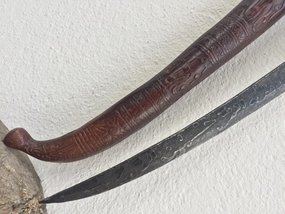 The blade is forged from steel for durability. Both sides of the blade is fully decorated with Jawi wordings, possibly verses from the Quran.
