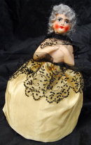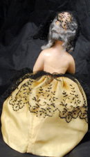 Lovely hand painted Antique Bisque 1/2 Doll Pin Cushion. 7" tall. She has a mohair wig, lovely fancy facial details, wearing a yellow satin dress with a black lace cover and mantilla. She is nude from the waist up but modestly covering her breast with her arms. Another thing I am not sure of is whether mantilla piece is meant to wear on her head or cover up her upper torso. I don't think she has every actually been used a pin cushion but this 1/2 has been made into this classic pin cushion doll style.