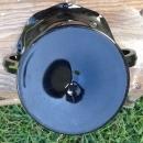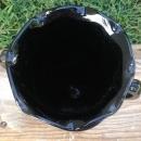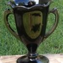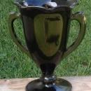 Black Amethyst Glass Trophy Vase with Two Loving Handles and Ruffled Edge. Vase is 8" high, 5 1/2" across top and 4" across bottom. Good condition.