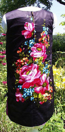 Black and Flowered Vintage Sheath Dress. The dress was bought in Hawaii in the 1960s although the tag reads Rhapsody by Glazier, Chicago, New York, Los Angeles. This is a black sleeveless dress with a pink lining on the inside with big pink flowers down the front and back. There are blue and orange flowers mixed in among the pink ones. The dress feels like rayon but no tag to tell. There is a slit up each side aprox 8 inches with a black bow at the top. The dress has a 17 1/2 inch zipper down the back and is aprox 40 inches long. It measure aprox 43 1/2 inches going around the dress. Beautiful Dress. Maybe size 14 or smaller. Worn only one time and in excellent condition. Pictures do not do the dress justice it will look prettier on you.