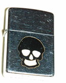 Older Zippo Lighter with black skull. It works but needs fluid. The condition is good, with gentle wear.