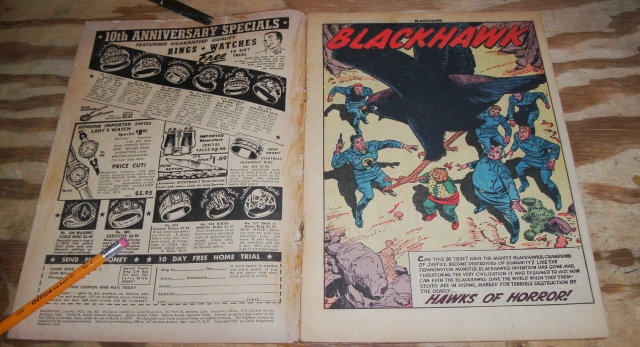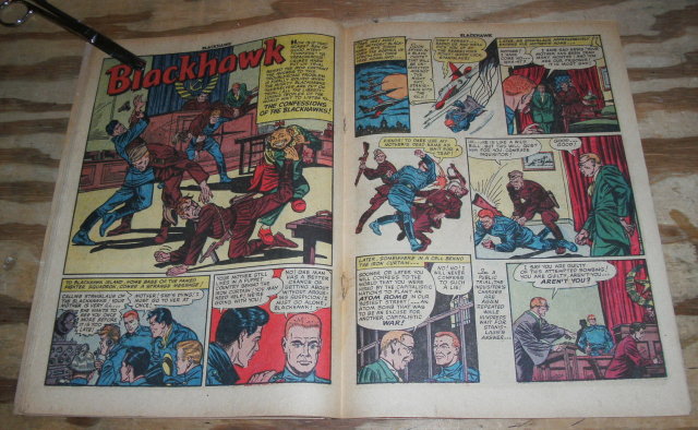 Paper meld repairing tear pointed to by scissors in 2nd photo. Stains on spine and top of cover visible from inside cover. Weak attachment to staples. Pages white and soft. Book is complete. minor creases.