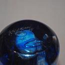 The piece is exquisite. The color is a royal blue and darker blue ribbons inside a clear case. The clear does not stand out so much unless you are looking the the sides. There are elongated oval stretched bubbles within and some other stretched shapes. It is a very heave piece weighing nearly 5 pounds unboxed. It is 8.75" tall and about 3.5" wide. The glass is about .5" thick.