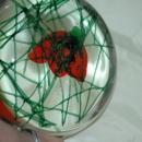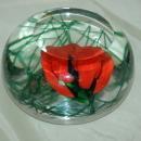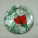 Blown Glass Red Poppy Paperweight with Smooth Top. It is more of a squat shape with a flat smooth circle on the top. Inside is a flower bud that looks to me like a red poppy. There are are green stems or foliage crisscrossing throughout. There are micro bubbles that stick to the leaves that sparkle in certain light. It is 2.5" high and 4" wide.