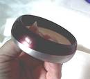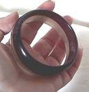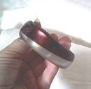 I love this bangle bracelet! But, alas, my hand is too large for it to slip on. The colors are eggplant and pearl white. It was not put together very cleanly, there are lots of inclusions between the layers. But, if you put it on to wear, they are not noticable, just when you put it up under bright light. There is some minor surface wear. It is approx. 7/8" wide and approx. 7 1/2" around the inside. The shipping fees quoted are for priority/No insurance in USA.