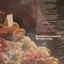 Braniff International 1968 Ad. This color 2 page October 29, 1968 ad states they said it would never fly. Untill a few years ago, airlines assumed that food on a plane had to be imperishable and downright indestructible. Then Baniff hired a group of top international chefts to rethnk the whole business. Picture shows Chef Willie Rossel twice winner of Cullinary Olympics standing a table of food. Magazine tear sheet picture is taken through plastic and may show wrinkles or crookedness that is not in the ad. This original magazine tear sheet measures 10 inches wide by 13 1/4 inches tall.