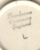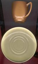Branksome Ceramics Cup and Saucer. Brown glaze outside of cup and yellow glaze inside. Saucer has yellow glaze. Cup is 3" high and Saucer is 5 1/2" across. Very good condition, rim of cup has some roughness. Glaze does have some crazing.
