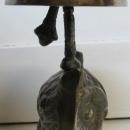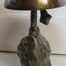 This is a very nice, brass bell that has a figural shape like an owl at the base with the bell forming a sort of umbrella over the owl's body. The inside of the owl is hollow, but is well weighted for the purpose and the bell ringer and pusher are in working order, makes a good clear sound. It stands about 7.5" tall overall and the bell is 3" diameter at the widest diameter.