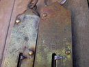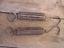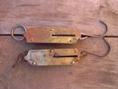 Pair spring balance coil resistance style farm ranch grain produce scales. Brass front face & rivets, cast iron & tin hooks loops backplates. John Chatillon & Sons New York & Sargent Company USA marks. 25 pound capacity measure.