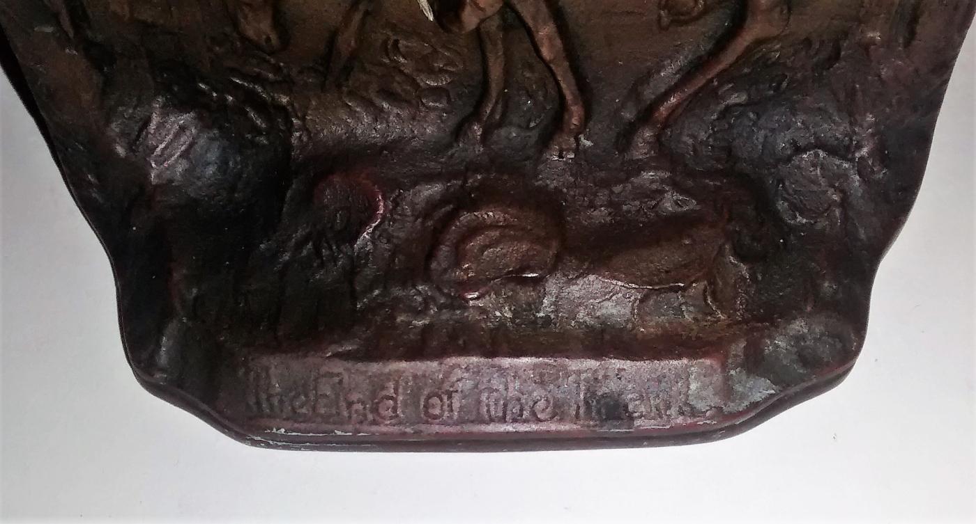 "The End of the Trail" single bookend, marked "Solid Bronze". Circa 1928. Native American Indian on horseback. Inscription across base. Measures 4"h x 4 3/8"w x 1 3/4" deep. Nice patina, with no major issues. Inglenook Antiques...Established 1989.