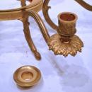Our lovely French gilt bronze centerpiece features six candle holders and cut glass bowl. Of the style and quality of Baccarat. Apparently unsigned. In very good condition. There is a small flake chip loss to the bowl as seen in our closeup image.