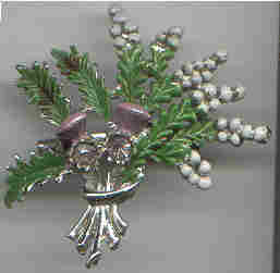 What a cute little pin. Christmas style with evergreen leaves and two small rhinestones at the ribbon closure. Just adorable. The brooch measures approx. 1 3/4"X1 3/4". The shipping fees quoted are for first class/No insurance in USA only.