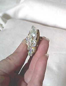 What a sparkler!!! The AB rivoli and crnter margarita beads are wired onto a pierced medallion. Then that is fastened to a solid back so that none of the wires show. The finish on the beads are in good condition. One of the beads has a tiny flea bite out of it, but is very had to see without close examination. It measures approx. 1 3/4" across and 1/2" high. The shipping fees quoted are for priority/Insured in USA.