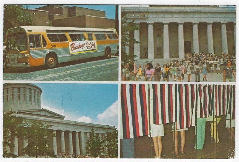 Postcard of Buckeye Girl's State, Ohio. Scenes of the Bus Used by the Girls, Capital Building and Voting Booths. Back is postmarked 1978. Postcard is in good condition, wear at edges