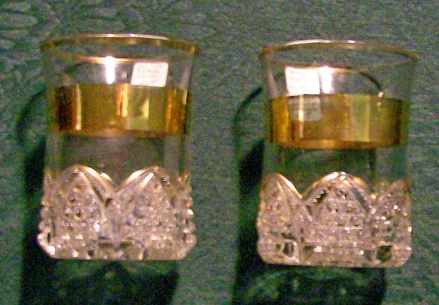 "Button Arches" pressed glass pattern tumbler pair, made by Duncan of Washington, Pennsylvania. Late 1800s. Measure 3 7/8"h. Clear with wide gold band around middle. Good condition, with only a few minor scratches. Sold as is, and as a pair. Inglenook Antiques...Established 1989.