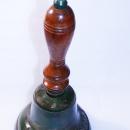 Antique Cast Iron Captain's Bell , with Wood Handle. It measures almost 12" tall and it heavy. It has the the clapper. It is painted green but the paint is worn in some places. The wood handle is chipped on one side as it was recently dropped however there no no damage to the bell.. Embossed across the front is the words " Captain's Bell". It has a very robust ring.