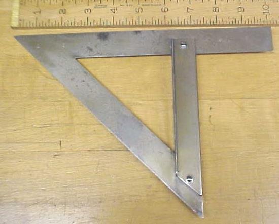 This is a rarely seen 10" mitre square marked "Challenge Cutlery Corp. Bridgeport Conn. Patented 1904". The tool is clean and rust free, but has had rust pitting on it in years gone by, so some blacked staining, and minor pitting noted. We note some minor scratches, but otherwise all the working surfaces are in very good shape. The inch increment can still be seen on one side, the other side with no markings. The guide lips are on both side for both shown and reverse mitres can be set by pushing the square up to the work piece edge. The lip is 1/4" high. A old version of the miter squares seen new on the market today are made of aluminum in many cases, this one is all steel, with a nice polished finish. In good useable condition overall. We find this one to be very similar to a later patented miter square "FOX's", that was patented in 1921. This one has an extra thick rail in the area connecting the 45 degree angle section to the graduated section, otherwise basically identical by comparison.