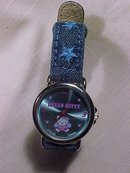 Cute Cheer Leader Hello Kitty Collectible Watch featuring the Kitty at the bottom holding blue pom-poms. The blue matellic dial has contrasting pink numbers at 12,3,6 & 9. The other time indicators are lighter shade blue stars. The the seconds dots are pink. "Hello Kitty" across the top is lighter shade of blue outlined in pink. The silver tone case is 1 1/8". The hour and minute hands are silver tone and the sweeping second hans is red.