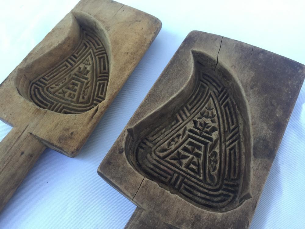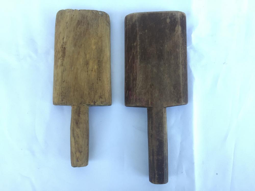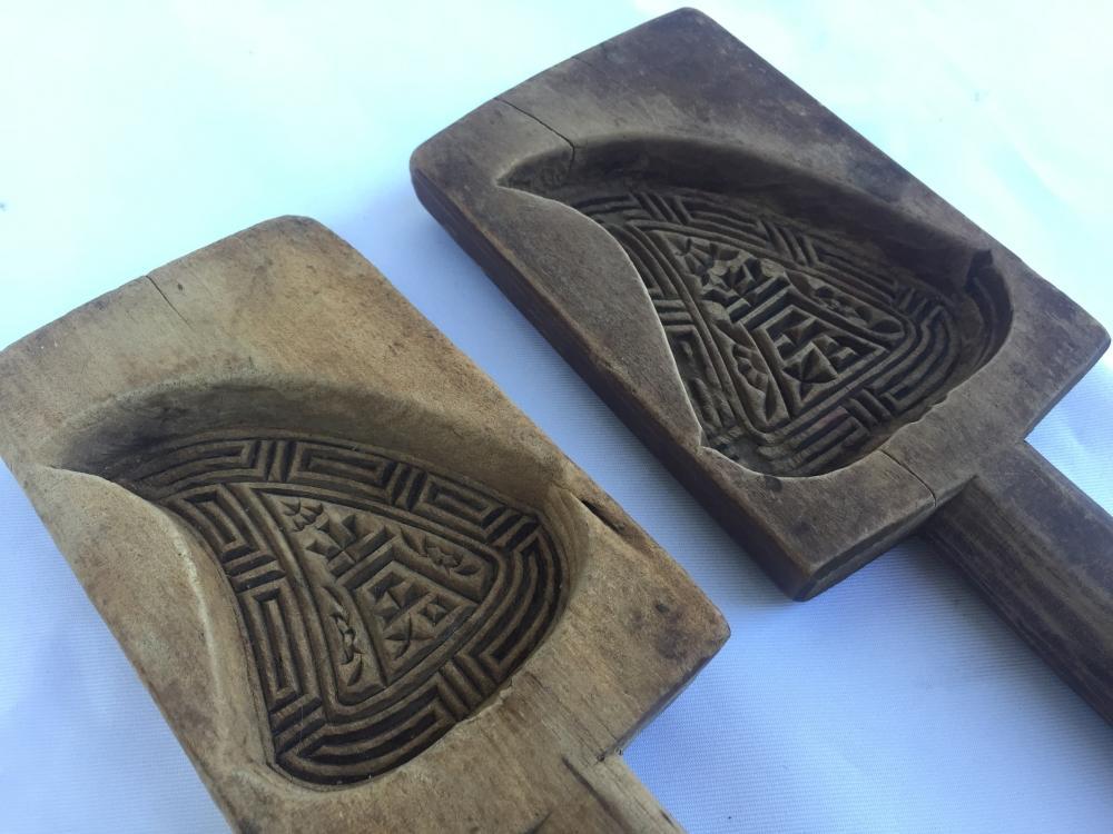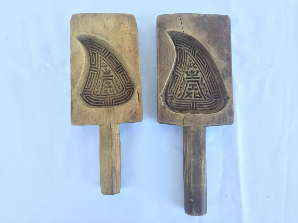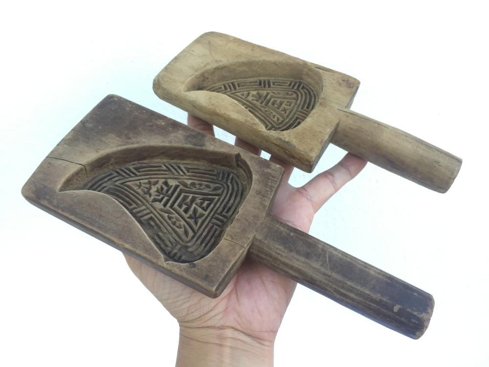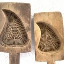 Two antique wooden CAKE MOULDS for Chinese cake making. Beautiful antique condition. Circa 1920. They are lovely pieces! In chinese or hokkien dialect, these pastries are call "ang ku" or red tortoise and very famous delicacies during chinese festivals.