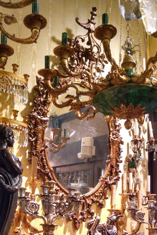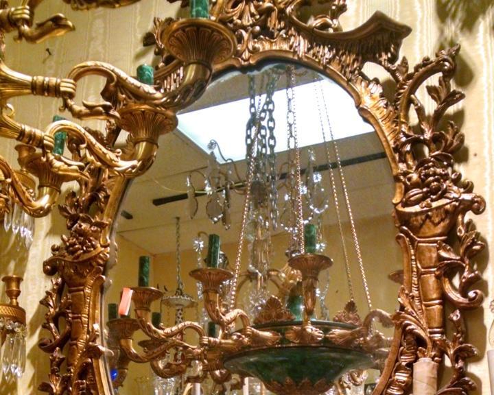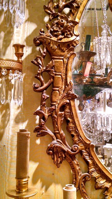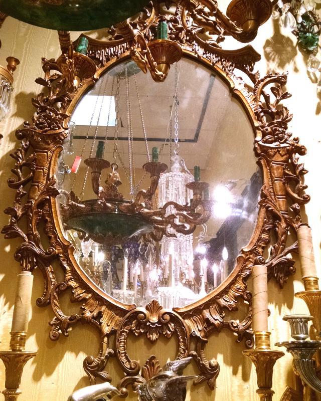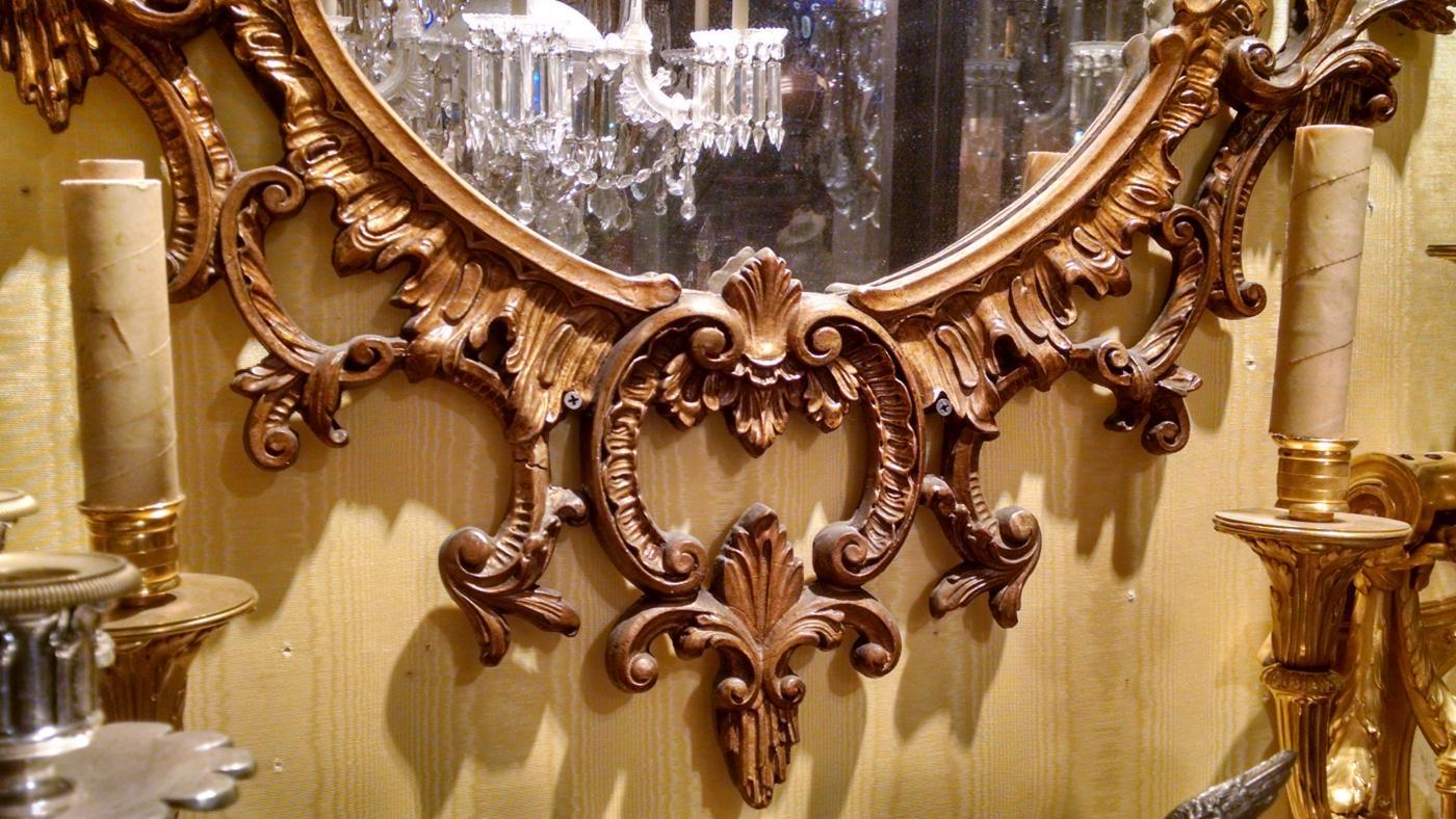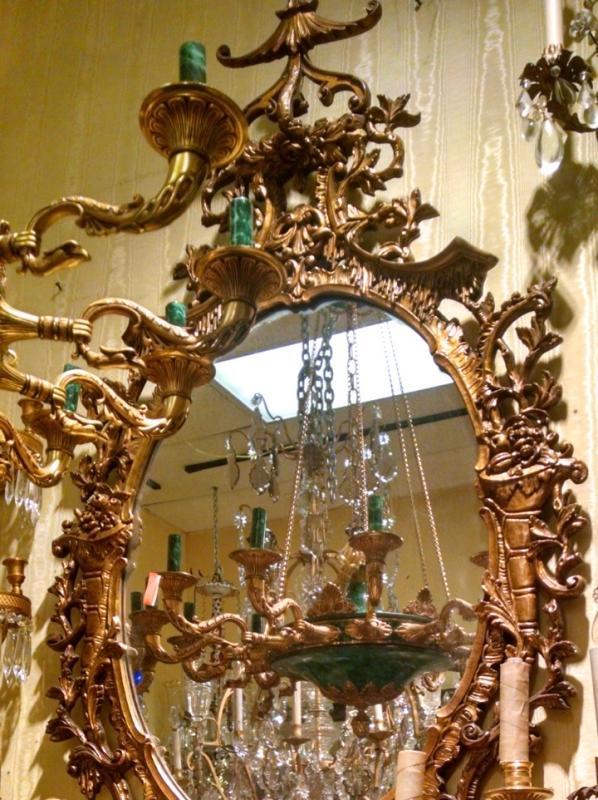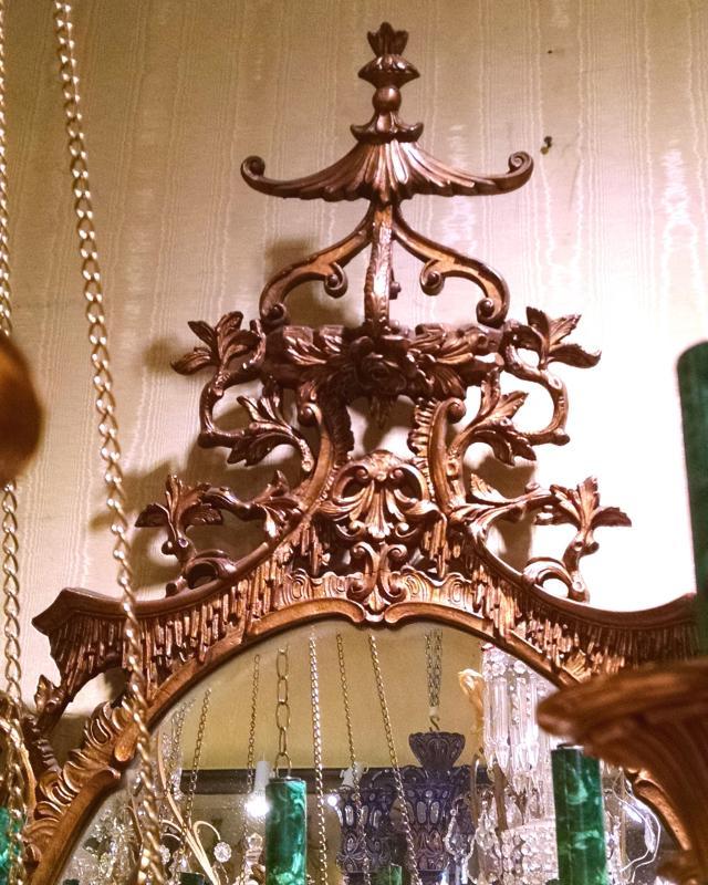 Our lovely giltwood mirror in the Chippendale Chinoiserie style measures 59 inches tall and 31 inches across and is in good condition.