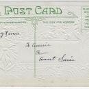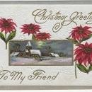 Christmas Greetings Postcard To My Friend. Snowy Church and Poinsettias. Back has writing but no postmark or stamp. Postcard is in good condition, wear at edges