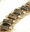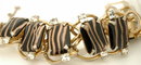 Dimartino Stunning super chunky bracelet of large black glass cabs that have copper colored metallic lines running through. Each line is trimmed with a big white crystal rhinestone on each side. The setting is a goldtone metal.