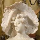 Our beautiful alabaster bust of a lovely female in fine dress with large bonnet is attributed to the Italian artist, Giovanni Pinotti Cipriani (active 19th-20th century). It measures approximately 30 inches tall and is in very good condition. There are small losses and scratches, two cracks to the socle, and we cannot rule out the possibility of restorations. The bust rests upon (not affixed) to a round socle that appears original.