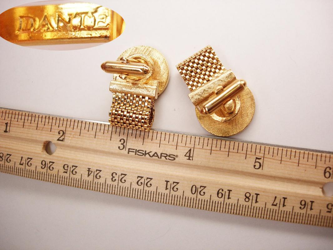 These are a very excellent pair of Wrap Mesh Green Enamel Clock Cufflinks. They are gold plated with a Green Enamel Clock face with Roman numeral style numbers. They are very colorful and flashy. They measure 3/4" in diameter and 2 1/4" in length. Perfect for a wedding or business. Quality by Dante.Dante manufactured primarily high quality men's jewellery and accessories in the 1960s (a division of Shields Inc). Cufflinks were often set with real semi precious stones like Lapis, onyx, agate and jasper. The company ceased operation in the 1970s cl O4 13