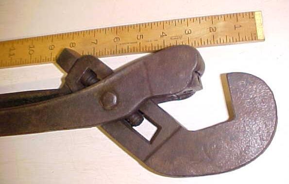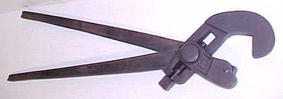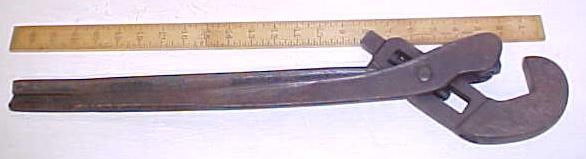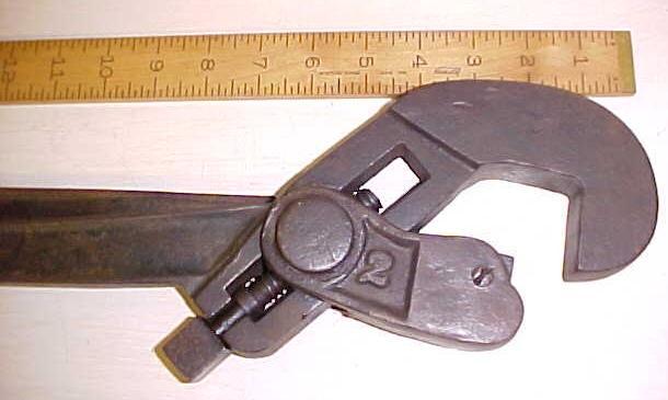 This is a nice antique, heavy duty pipe tongs or wrench first patented in this design by Acme in 1880. Though these tongs look more like giant pliers, the patented design basically features a heavy duty pivot, and two jaws, one the has a hardened steel cube the turned at a 45 degree angle actually grips the pipe, while the L-shaped jaw holds the pipe up against the gripper jaw. This wrench is in the Antique and Unusual Wrenches collector's book by Schulz on page 58 and is number 733. This one is not marked by the maker, so I am using Schulz's book to date and name the maker in this case. This wrench/tongs is marked "2" only. It is an adjustable wrench, for pipe up to about 2.75" diameter. It is 23.5" long overall, no rust, not much paint left on it, but not damaged. It is useable in present condition. An interesting patented design from the late 1800's era. I was told this wrench was used on local oil wells and drilling rigs in this part of Ohio.