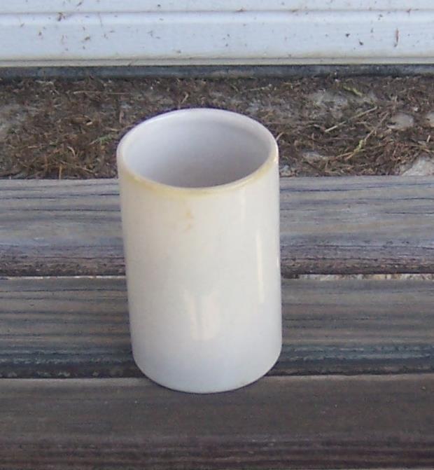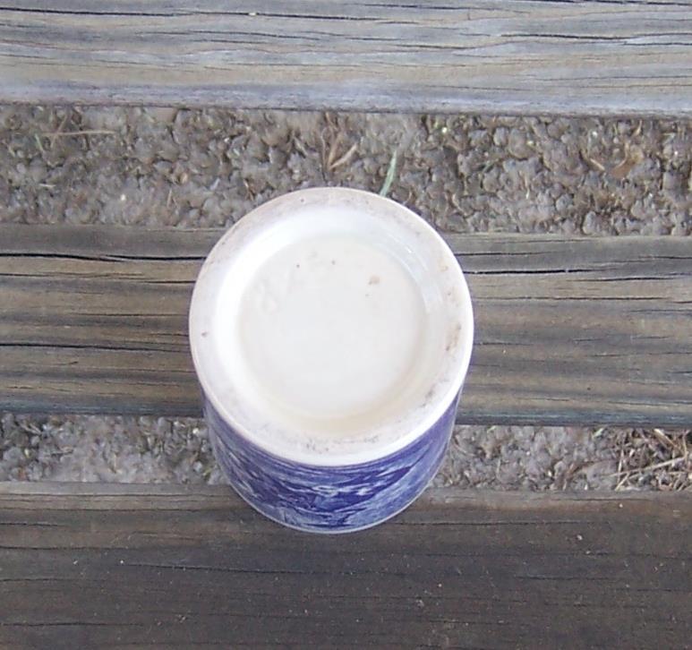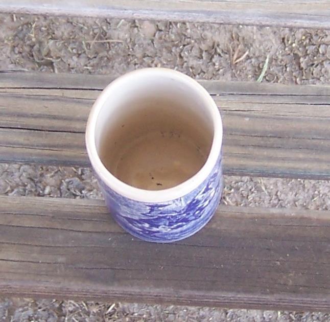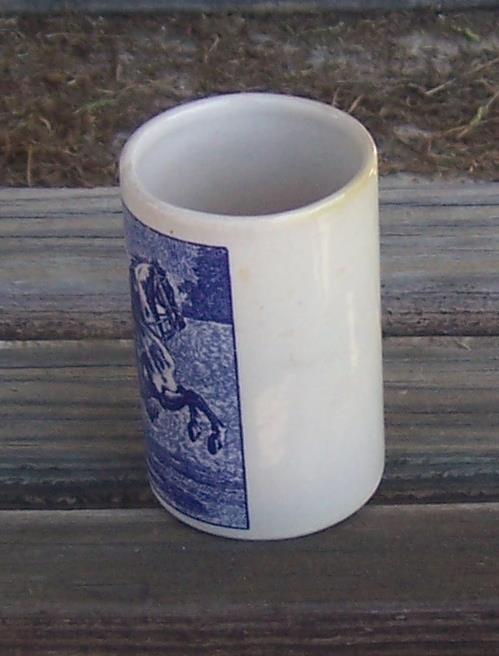 Vintage Pottery Tumbler with Blue and White Horseman on Front. Tumbler is 3 1/2" high and 2" across. Good condition.