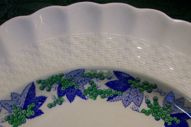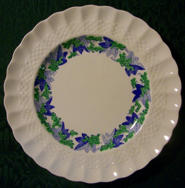 "Valencia" pattern salad/dessert plate set of 4 with Copeland Spode mark. 1944-72, #S/1248. Green grapes and blue leaves on a white background, with basketweave border and scalloped rim. Measure 7.75"d. Some crazing and surface scratches; no chips or cracks to the pottery. Sold as is, and as a set of 4. Email any questions. Please see our other listings in this pattern. Inglenook Antiques...Established 1989.