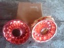 Pair 1960's era copper tone aluminum dessert cake mold baking forms with original plain cardboard shipping box.