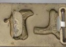 Cowboy boots & six shooter belt buckle. Appears to be old, heavy metal, gold paint that has age patina, few nicks along bottom edge, but I consider excellent. 1 1/2 x 2 3/4" Please note pictures may be larger than items!