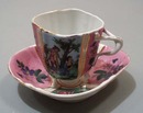 Cup & saucer set, hand painted pink and lavender shades. Deep saucer and rope twist handle. The artwork on this is not real good, but still is attractive. The scene shows man with blindfold on playing game with young lady. No markings, but I would think this is from Japan. Bottom would work for a soap dish as well as the saucer. This has some gold wear, but still excellent condition. Saucer is 5 1/2 x 1 1/4Deep and 4 1/2" across Cup is 3 footed, Aprox 3 x 3 not including handles