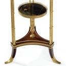 Our gueridon in the Louis XVI style, after the original design by Adam Weisweiler (1744-1820) is finely crafted from mahogany and thuya wood and ormolu bronze, and features japanned Chinoiserie scenes on table top and stretcher. Underside of the top carries the spurious stamped mark, A. WEISWEILER. Condition is good. There is wear to each table top particularly at the seams of the panels, and some warping to the top, plus some oxidation to the gilding in spots. An exceptional example of Chinoiserie style and one of the finest antique reproductions of Weisweiler's designs we have seen in our 20 years in business.