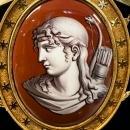 Our antique necklace with enamel pendant depicting the Roman goddess, Diana, has a wide gold mesh chain. Apparently unsigned.