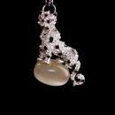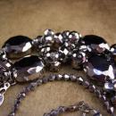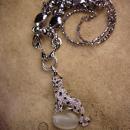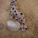 This exotic creature who is so powerful and exotic will make any outfit quite alluring. The photos don't do the sparkle that comes off this mercury glass necklace justice. He and his chains are a whopping 5" long and he has rhinestones all over him with black enamel. One really large cats eye stone is at the bottom. It doesn't show in the photos how the eye in it actually moves. A fabulous designer statement piece.